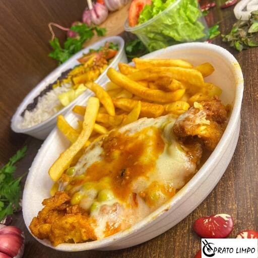 Filé de frango empanado, coberto com molho de tomate artesanal e queijo derretido. Acompanha arroz soltinho, feijão, macarrão, refogado, farofa, salada fresca e sobremesa de cortesia.