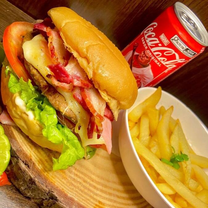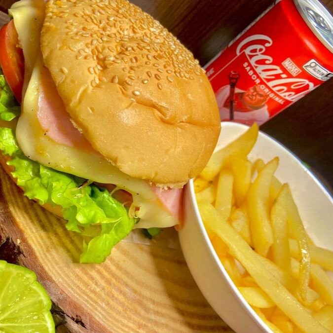 Um X-Bacon delicioso vem com um pão macio e tostado, recheado com hambúrguer suculento, queijo derretido, bacon crocante, alface fresca e tomate. Acompanha uma porção de batata frita dourada e crocante, além de um refrigerante gelado de 220ml, formando a combinação perfeita para uma refeição saborosa e completa.