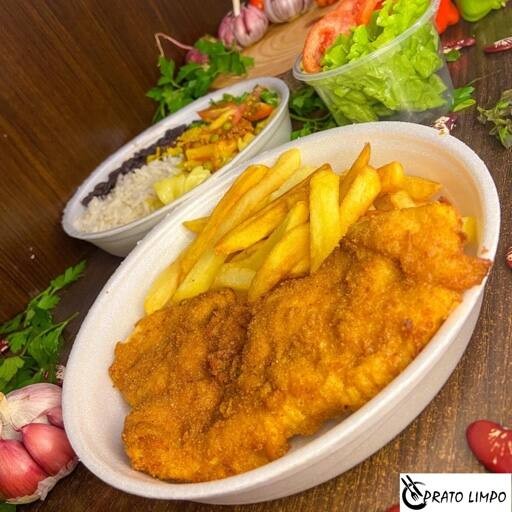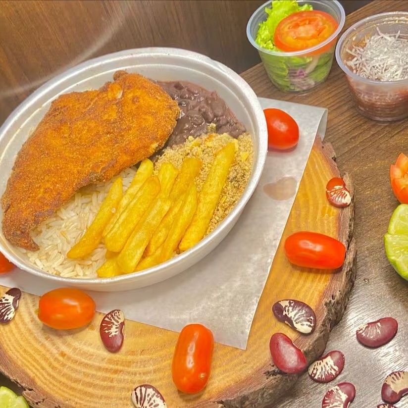 Frango empanado crocante por fora e macio por dentro, preparado com tempero caseiro e sabor irresistível. Acompanha arroz soltinho, feijão temperado, batata frita, farofa, salada fresca e sobremesa de cortesia.
