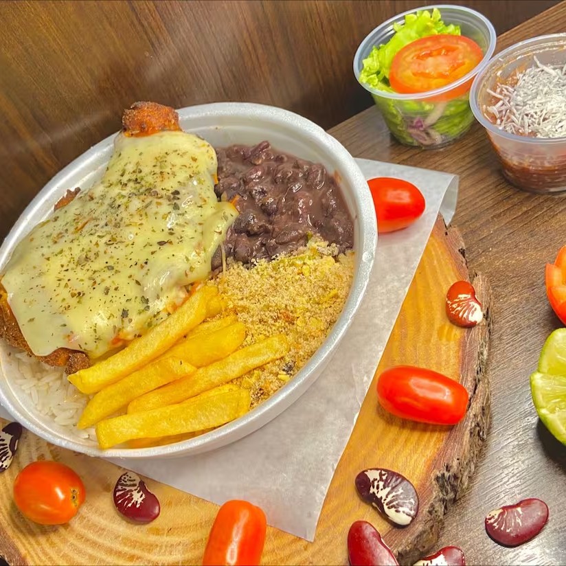 Bife empanado coberto com molho de tomate artesanal e queijo derretido, preparado no capricho. Acompanha arroz soltinho, feijão, macarrão, refogado, farofa, salada fresca e sobremesa de cortesia.
