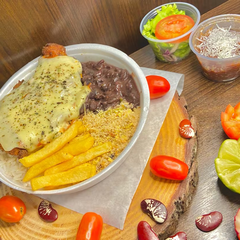 Frango à parmegiana suculento, empanado e dourado na medida certa, coberto com molho de tomate caseiro e queijo derretido, trazendo aquele sabor irresistível de comida feita com carinho. Acompanha arroz soltinho, feijão temperado, batata frita, farofa, salada fresca e sobremesa de cortesia.