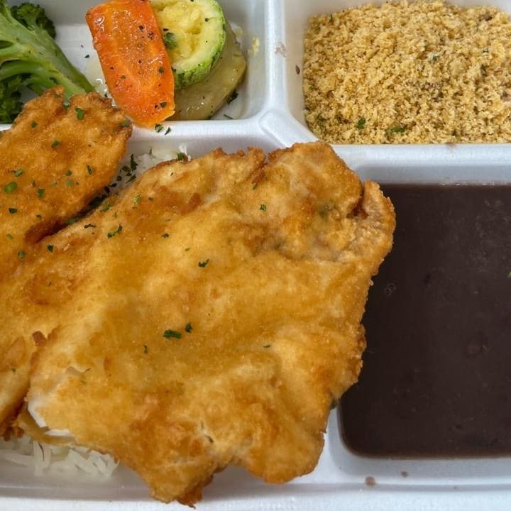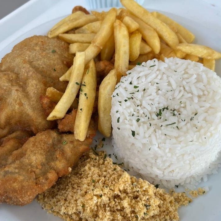 Arroz, feijão, farofa, batata fritas e salada. Se quiser trocar suas fritas por legumes grelhados, só pedir nos complementos. Tudo fresquinho e preparado com muito carinho. Nossa embalagem vai toda separadinha sua refeição. Feijão dependendo do Dia é branco e dependendo do Dia é o preto.