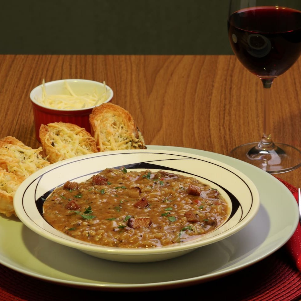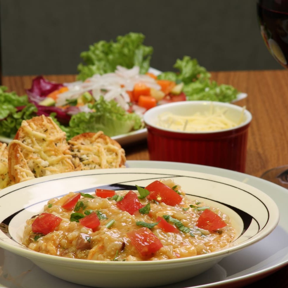Arroz arbóreo, funghi desidratado, tomate, champginon, iscas de carne bovina, manjericão e salsinha. Os adicionais pagos (extras) já são incluídos no preparo, não vão separados. Exceto o queijo ralado
