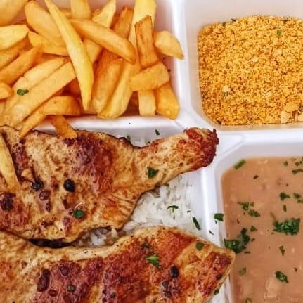 Arroz, feijão, farofa, batata frita e salada. Caso queira trocar suas fritas por legumes na chapa só pedir no complementos. Tudo fresquinho e feito com carinho. Enviamos na embalagem tudo separadinho.