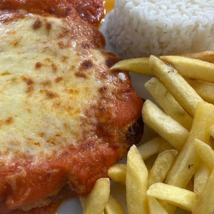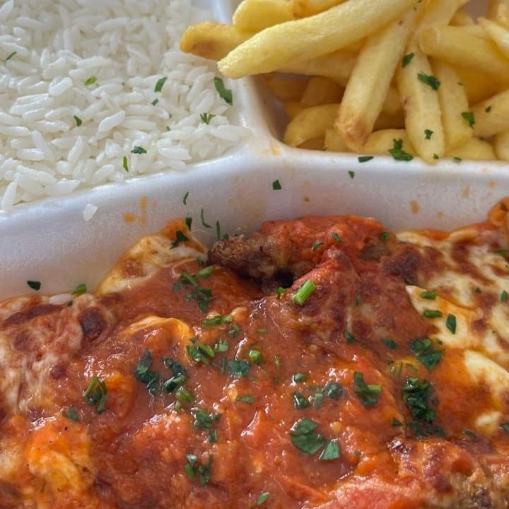 Delicioso parmegiana de carne, acompanha arroz, batatas fritas e salada. Nossa embalagem permite que os itens sejam embalados separadamente. Sem contar que é o melhor parmegiana do Bacacheri
