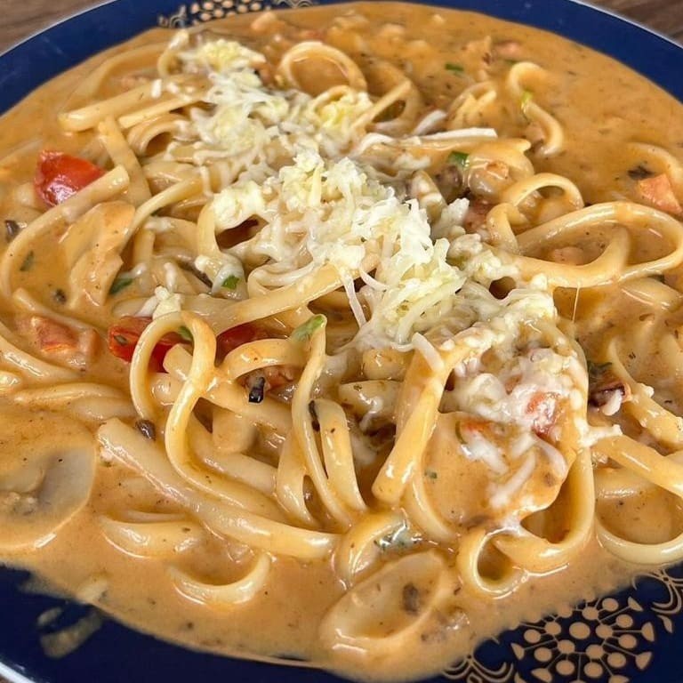 Uma deliciosa e perfeita combinação. Fetuttini ao molho rose (molho branco e ao sugo), iscas de carne bovina, alcaparras, champignon e manjericão. Os adicionais (extras) já são inclusos no prato.