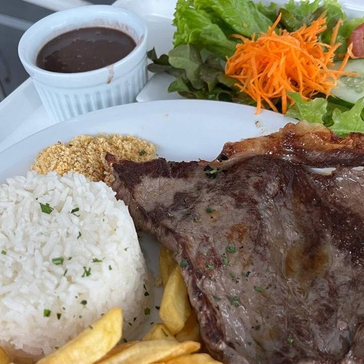 Delicioso filé de alcatra grelhado. Acompanha arroz, farofa, polenta frita, legumes na chapa, e salada . Serve 3 pessoas).