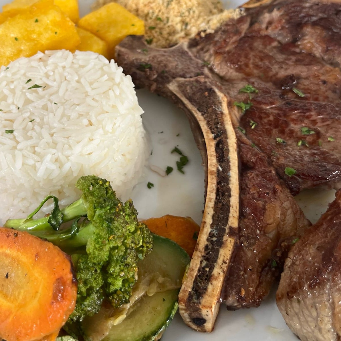 Deliciosa chuleta grelhada, acompanha arroz, farofa, polenta frita, feijão e salada.