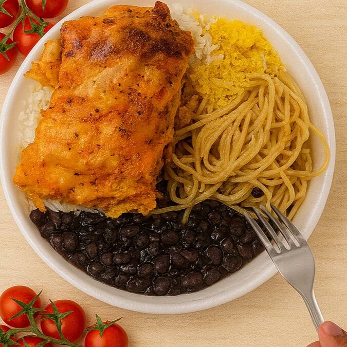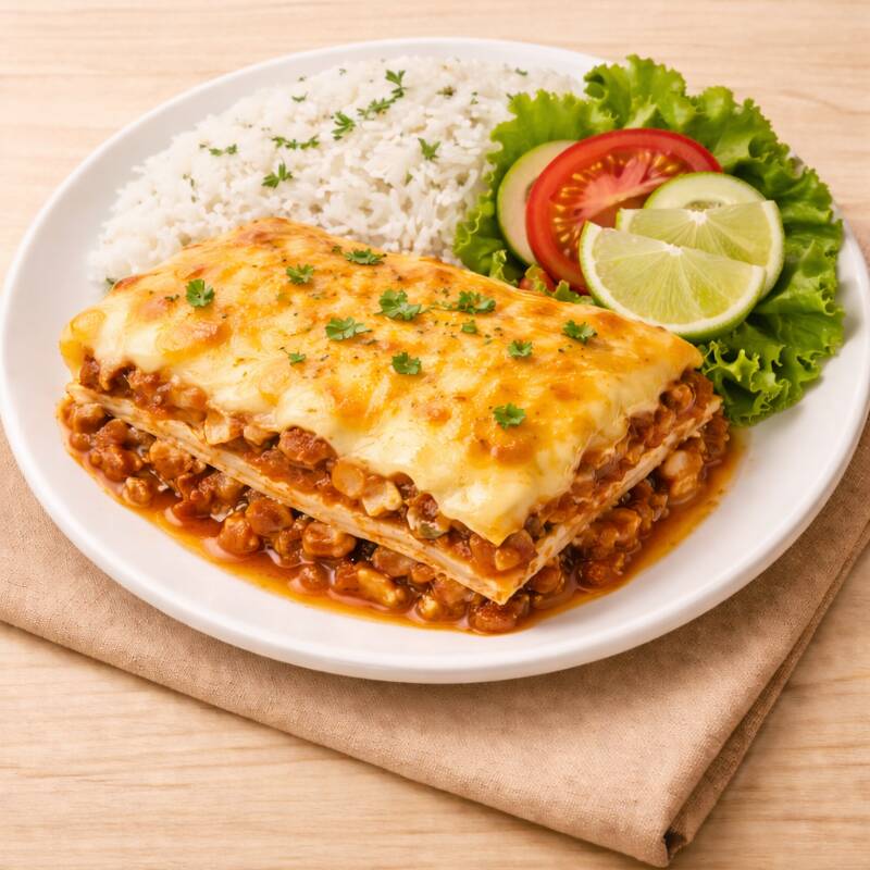 Camadas de massa macia recheadas com carne moída selecionada, molho bolonhesa encorpado, molho branco caprichado e molho vermelho caseiro, finalizada com queijo gratinado que derrete. Acompanha arroz soltinho, feijão fresquinho, farofa crocante, salada fresca e refogado caseiro.tamanho P — prática, cremosa e cheia de sabor!