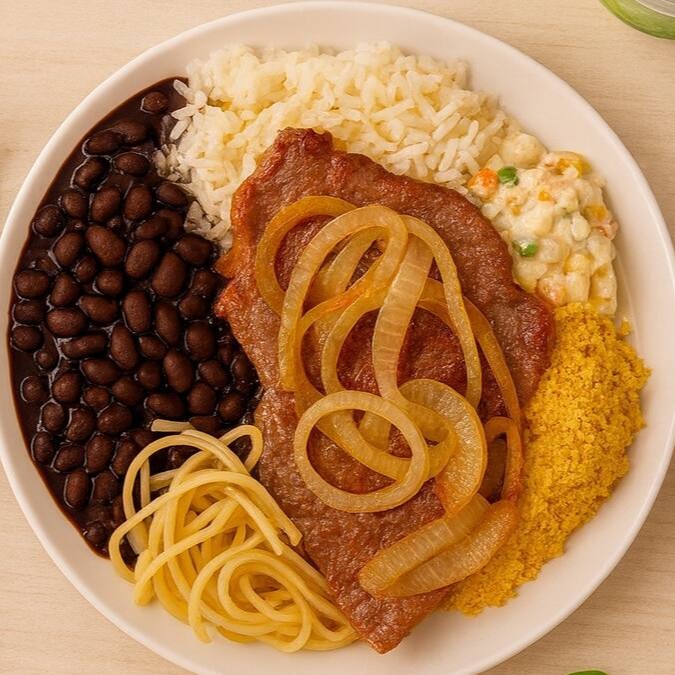 Clássico que nunca sai de moda! Bife acebolado + arroz, feijão, macarrão e salada. Um prato caseiro, saboroso e caprichado, para quem ama comida de verdade