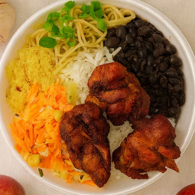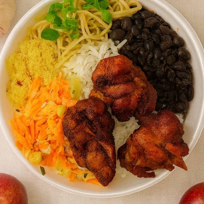 Pequeno e saboroso! Frango a passarinho bem temperado, crocante por fora e suculento por dentro, acompanhado de arroz soltinho, feijão fresquinho, macarrão caseiro, farofa douradinha, salada leve e refogado caprichado.