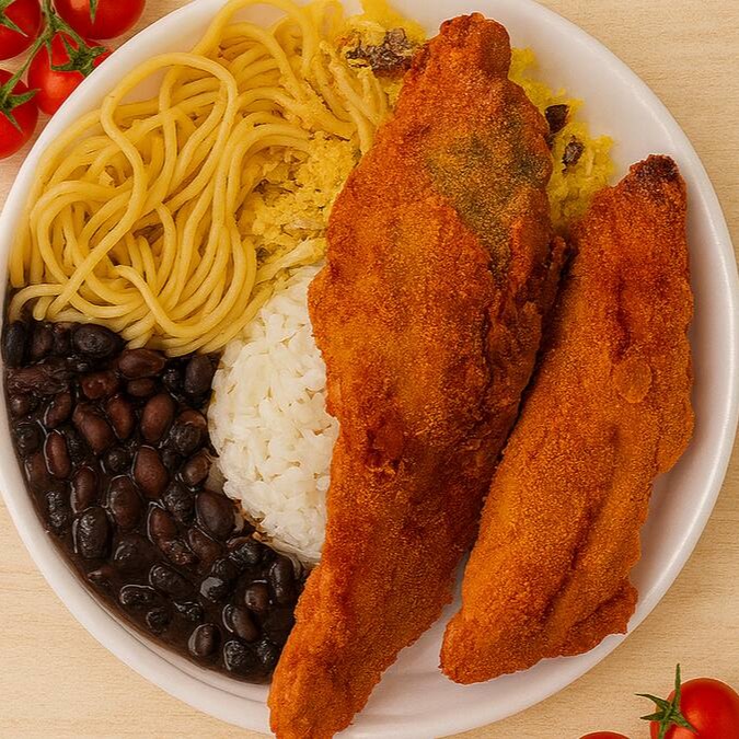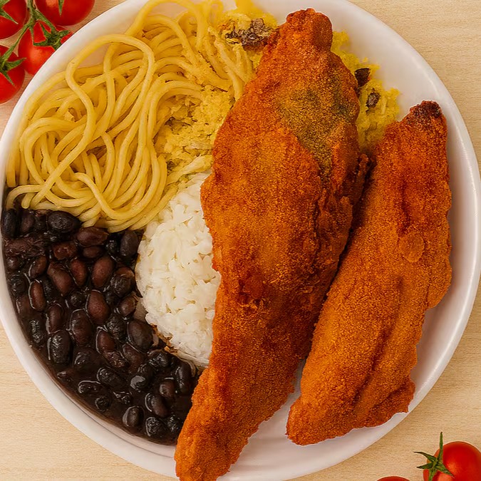 ilé de peixe fresco à milanesa, sem espinha, crocante por fora e macio por dentro, servido com fartura de sabor. Vem com arroz soltinho, feijão temperado, farofa douradinha, salada fresca e refogado caprichado. Tamanho médio — perfeito para matar a fome!