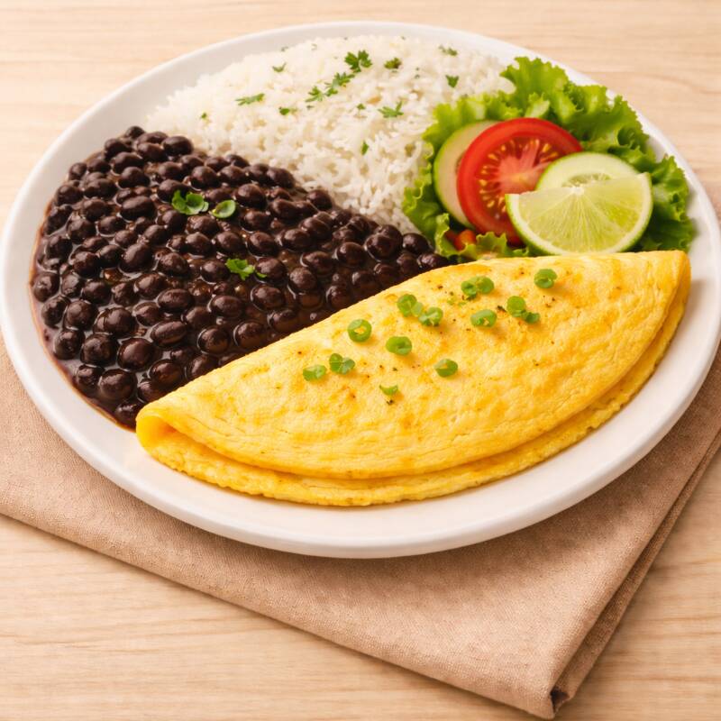 Arroz soltinho, feijão preto encorpado e um omelete dourado no ponto certo, leve por dentro e macio por fora. Uma combinação simples, caseira e irresistível — feita com cuidado, sabor e aquele gostinho de comida de verdade.
