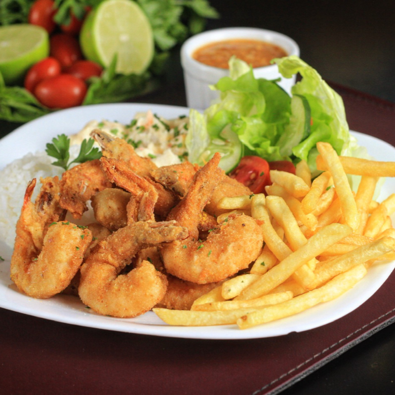 2 bolinhos de camarão, Camarões à Romana, Camarões à Paulista, Camarões ao Bafo, Camarões à Milanesa. Acompanhado de molho de camarão, maionese de camarão e arroz branco. **não é possível alterar a combinação dos pratos**