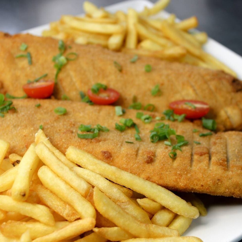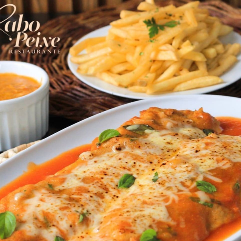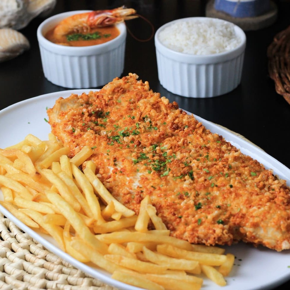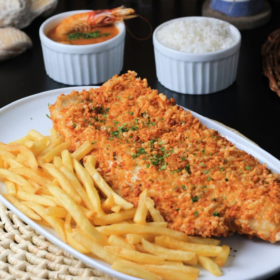 Filés de peixe à milanesa ao molho de camarão sete barbas. Acompanha batata frita e pirão de peixe.