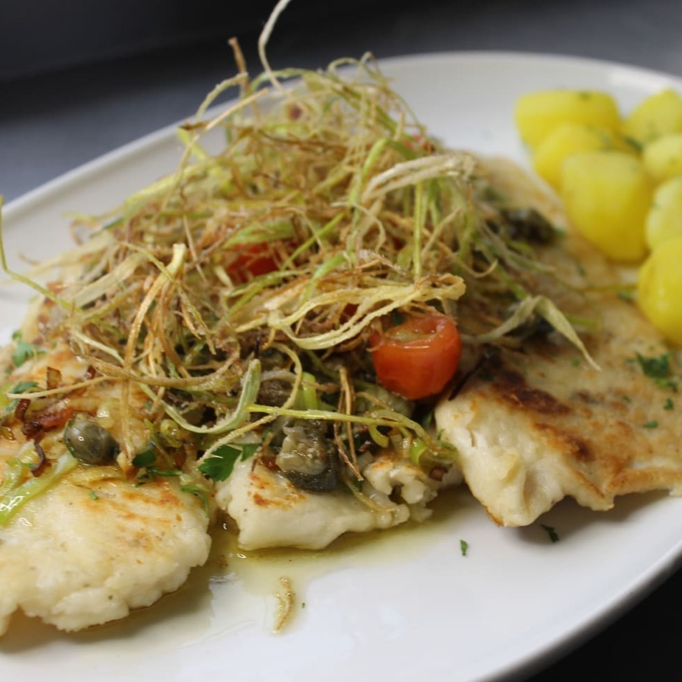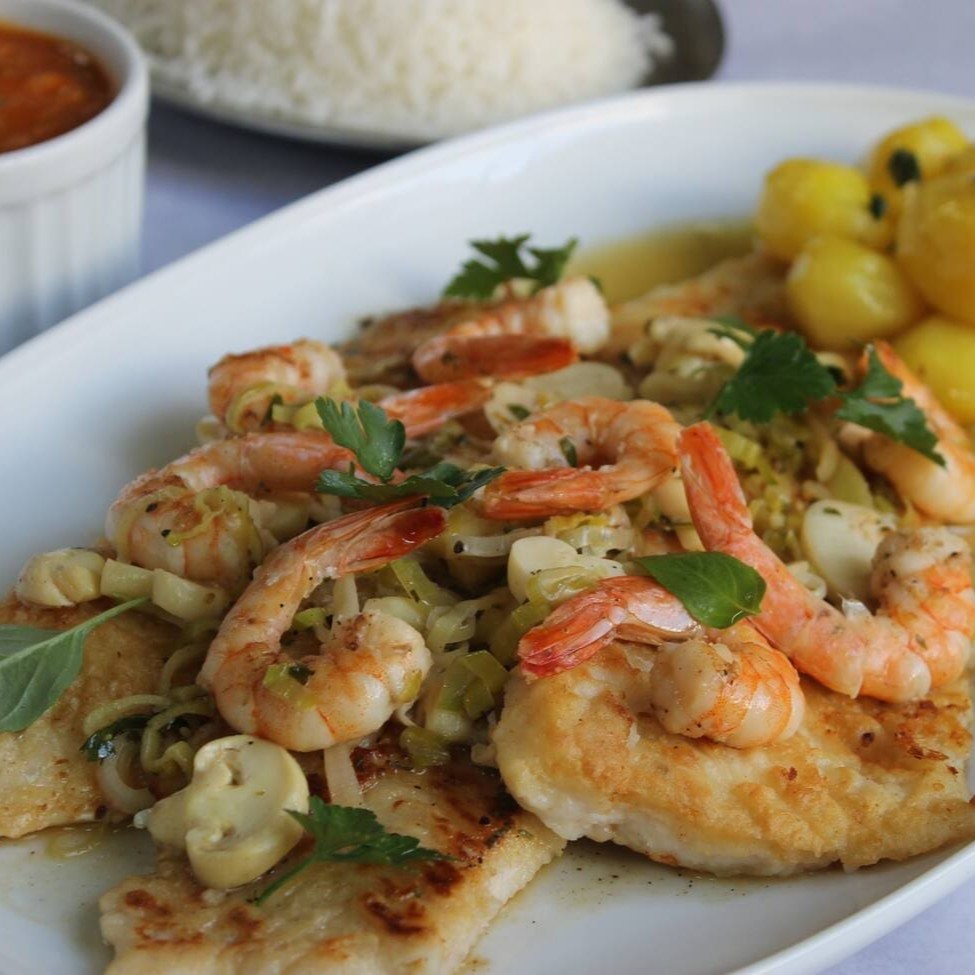 Molho clássico a base de manteiga e vinho branco, com alho poró , camarões grelhados, ascaparras e champignon. Acompanha arroz branco, batata sauté.