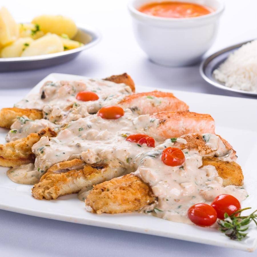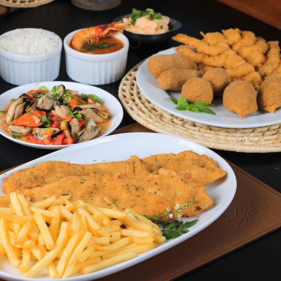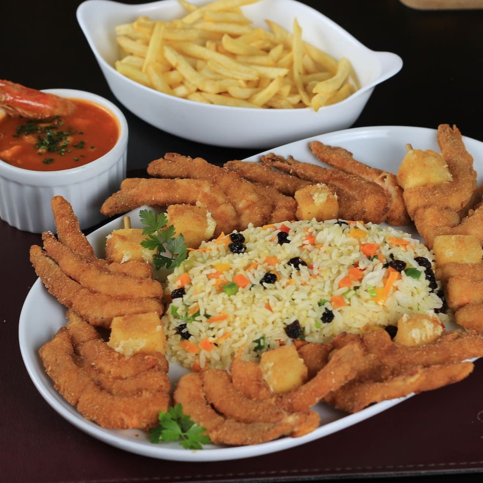 Lula, isca de tilápia, camarão à milanesa, casquinha de siri, batata frita e molho de ervas. **não é possível alterar a combinação dos pratos**