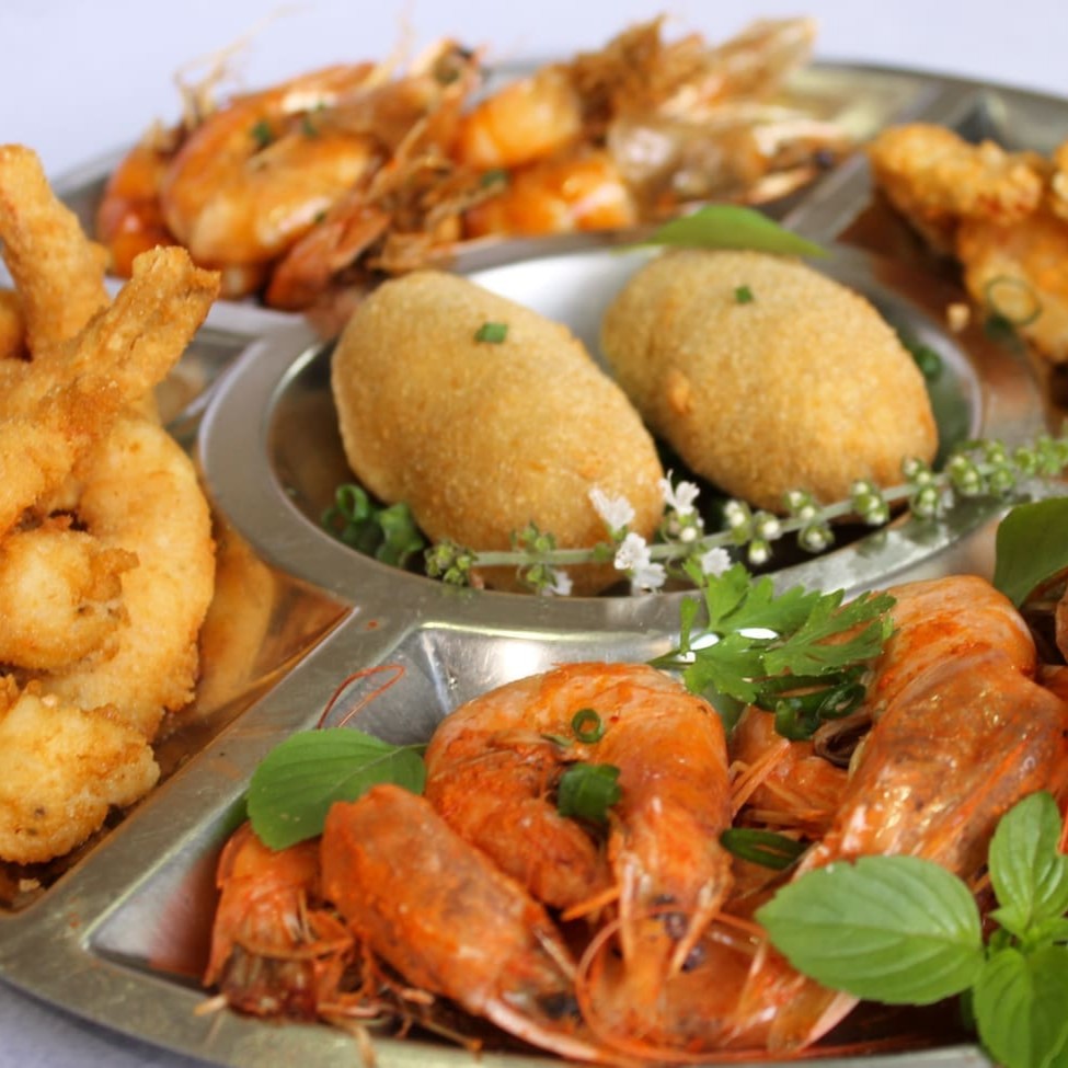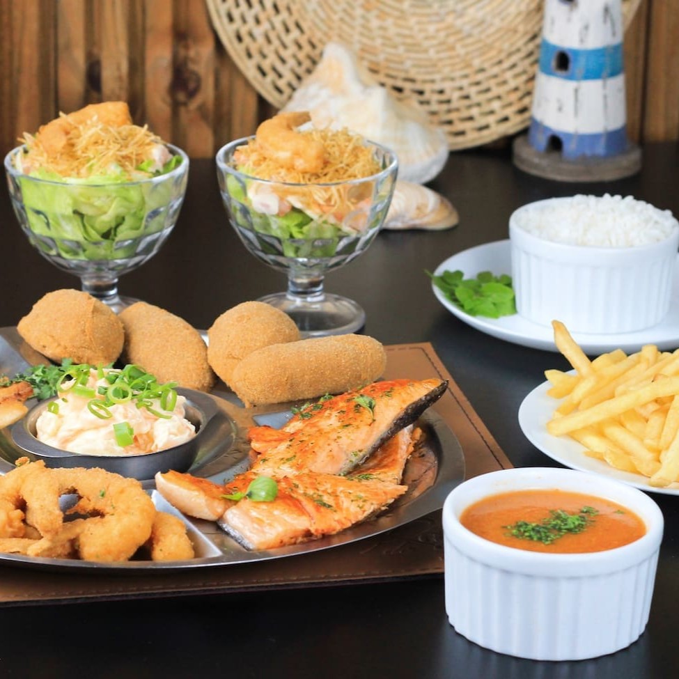 Coquetel de camarão, 2 casquinhas de siri, 2 croquetes de camarão, Camarões à milanesa, Tilápia grelhada e Salmão grelhado. Acompanha molho de camarão, maionese, arroz branco e batata frita. **não é possível alterar a combinação dos pratos**