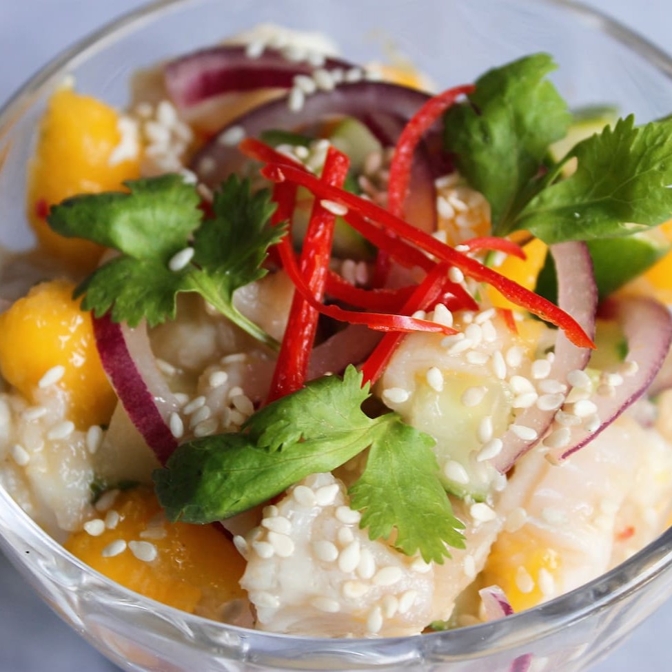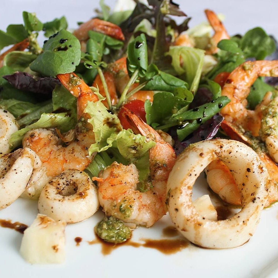 Seleção de folhas, acompanhadas de camarões, lulas e abacaxi ao molho de redução de vinagre balsâmico.