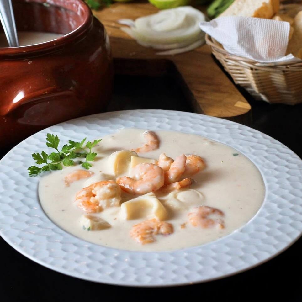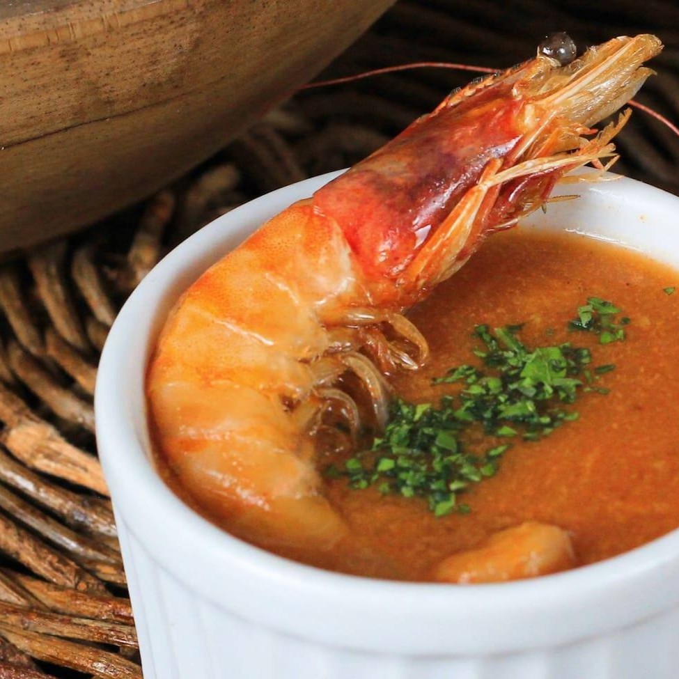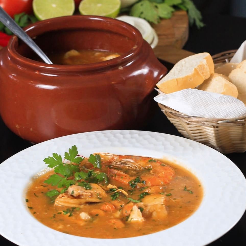 Sopa de camarão, peixe, siri, lula e marisco (1 Litro). Acompanha torradas.