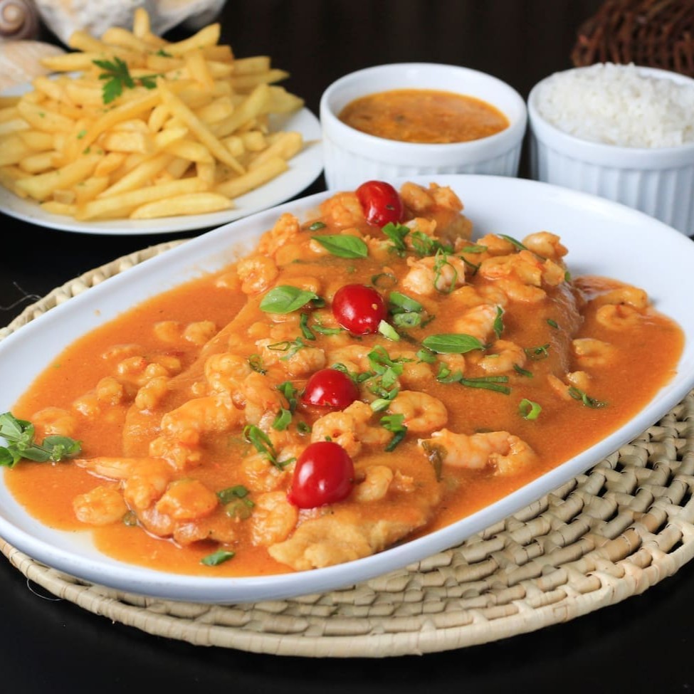 Camarões (400g) flambados ao molho rosê, cobertos por casquinha crocante de parmesão gratinado. Acompanha arroz branco e batata frita.