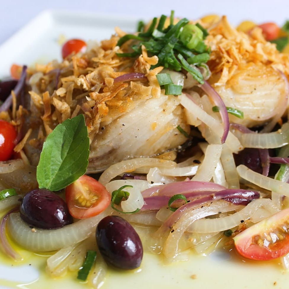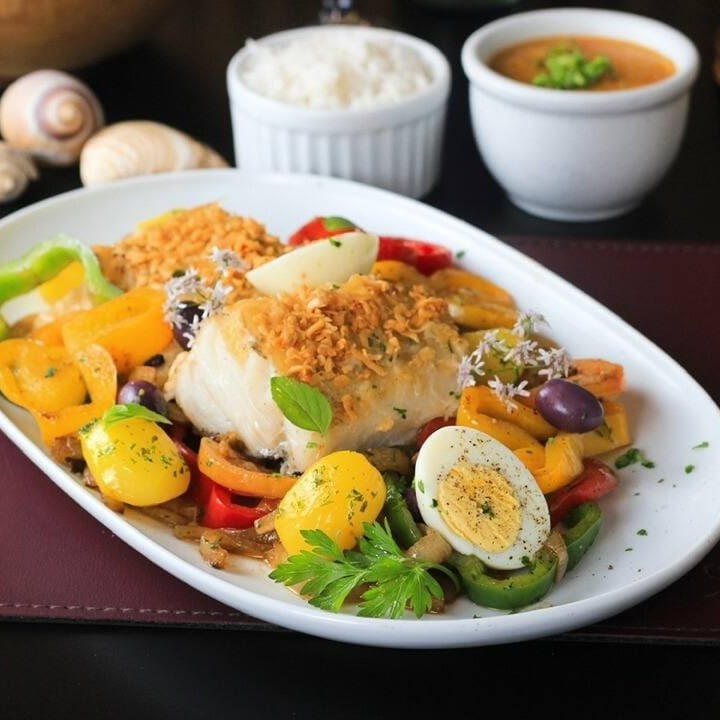 Posta de bacalhau Gadus Morhua grelhado guarnecido de cebolas, azeitonas e tomate cereja confitado. Coberto com alho crocante e muito azeite de oliva extravirgem. Acompanha arroz branco e pirão.