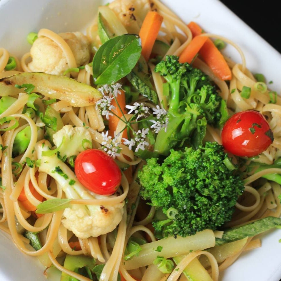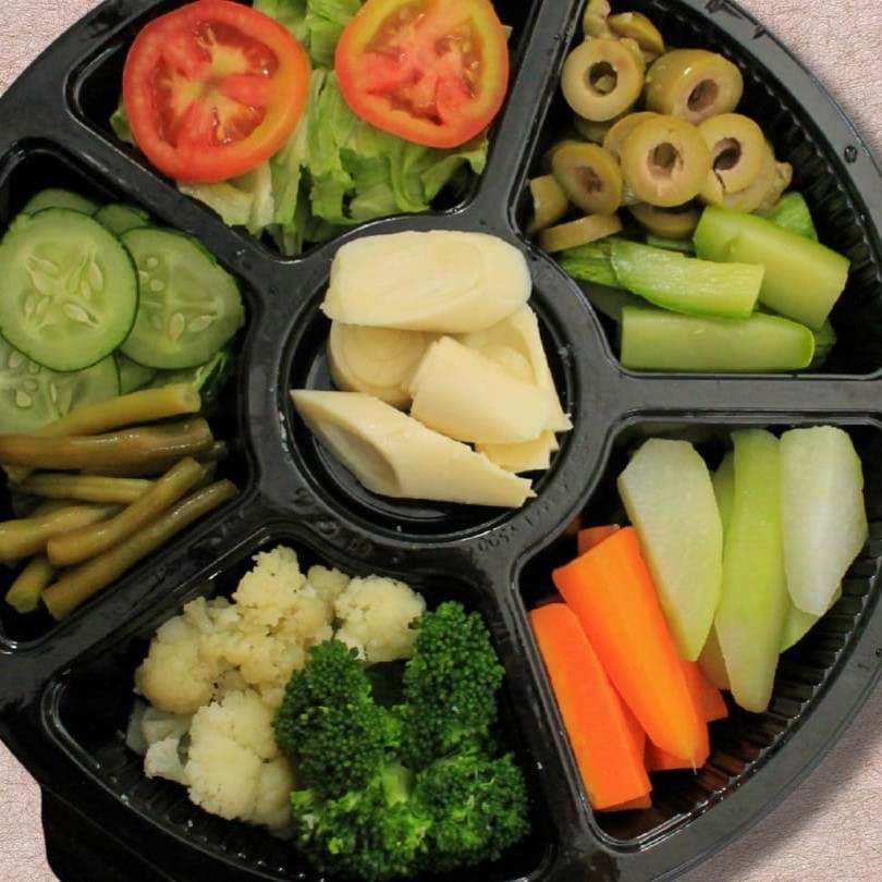 Cenoura, couve flor, alface, azeitonas, palmito, brócolis, tomate e vagem.