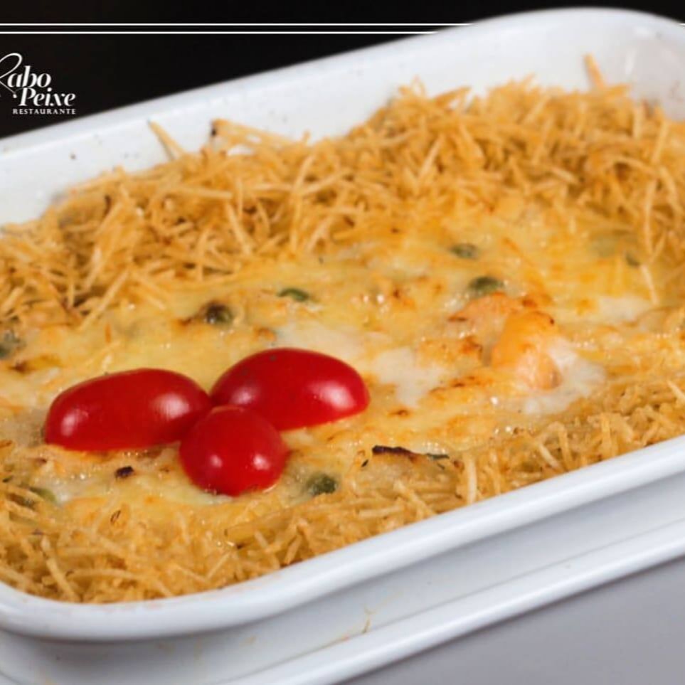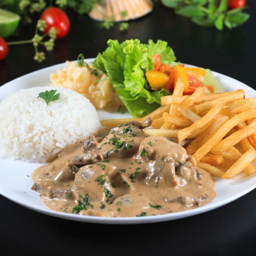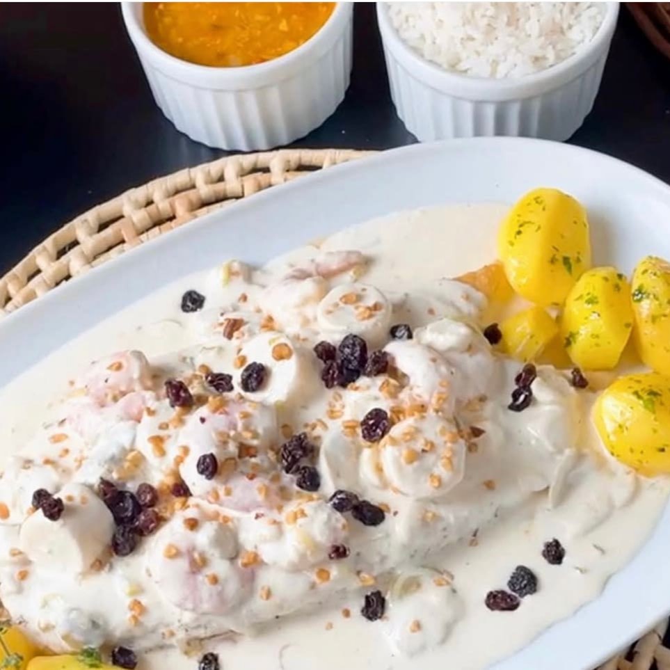 Saboroso molho branco à base de camarões, palmito, uvas passas e amendoim. Acompanha arroz branco e batata sautê.