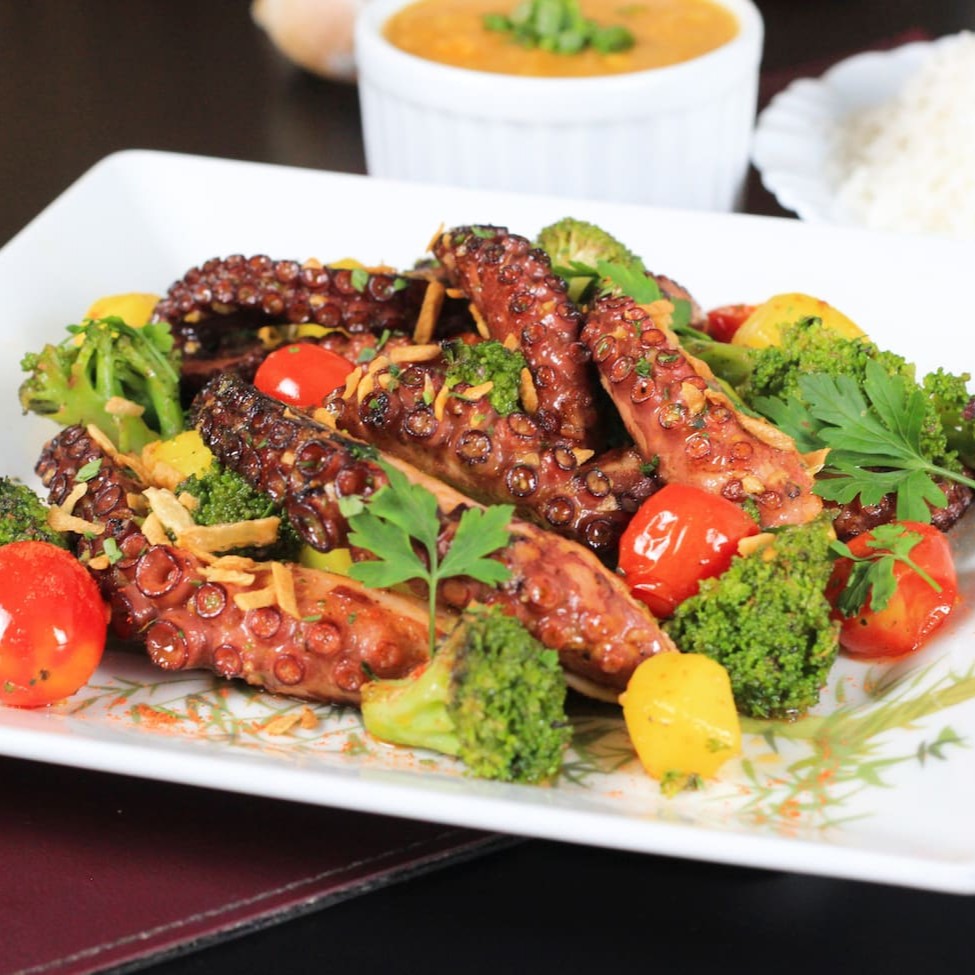 Porção de polvo grelhado ao alho e óleo, com brócolis e tomate cereja confitado. Acompanha arroz branco e pirão de peixe.