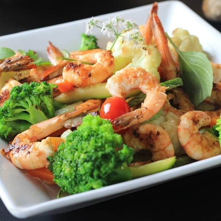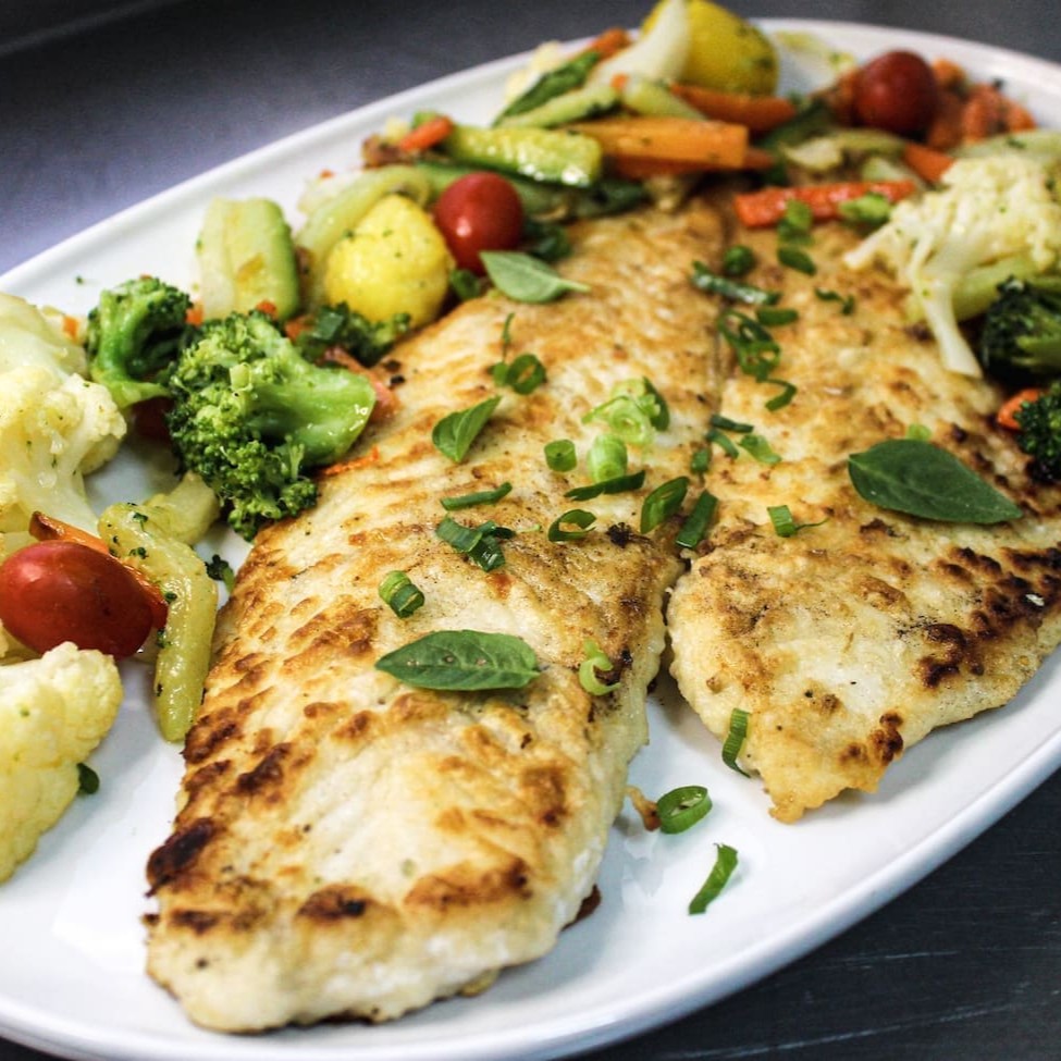 Filés grelhados, legumes na manteiga, arroz branco e molho de camarão.