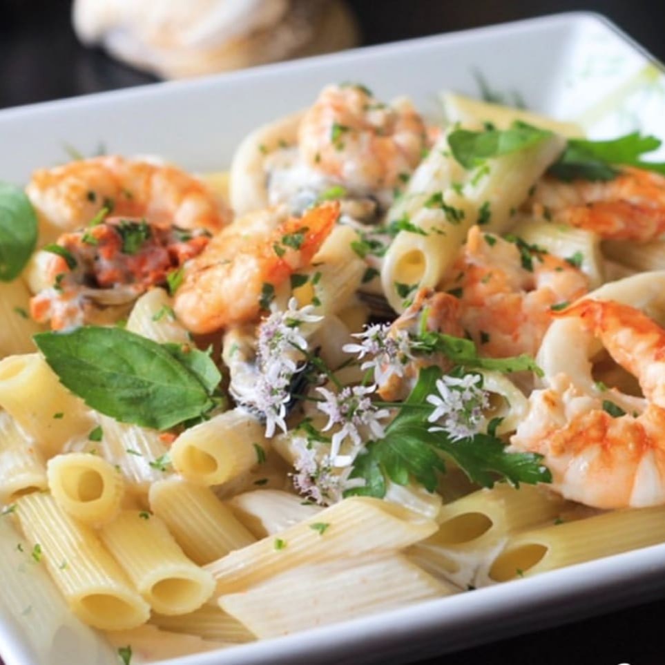 Penne regado ao molho cremoso, com mariscos, camarão e lula.