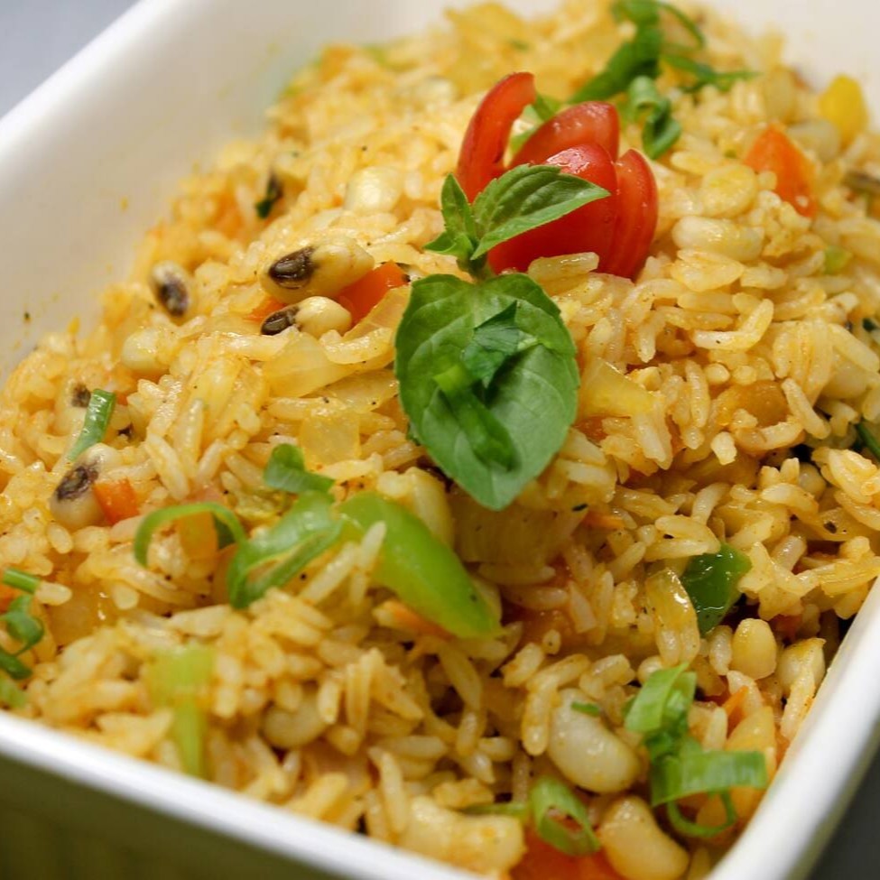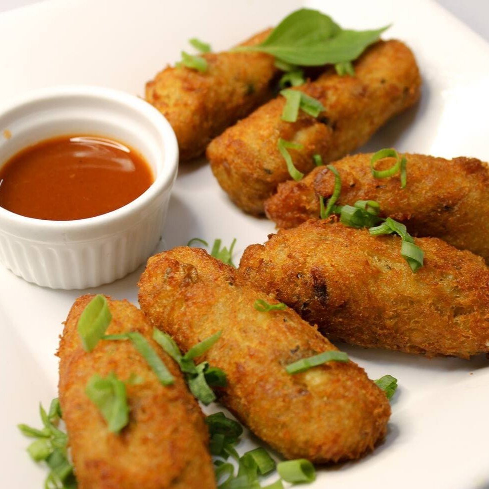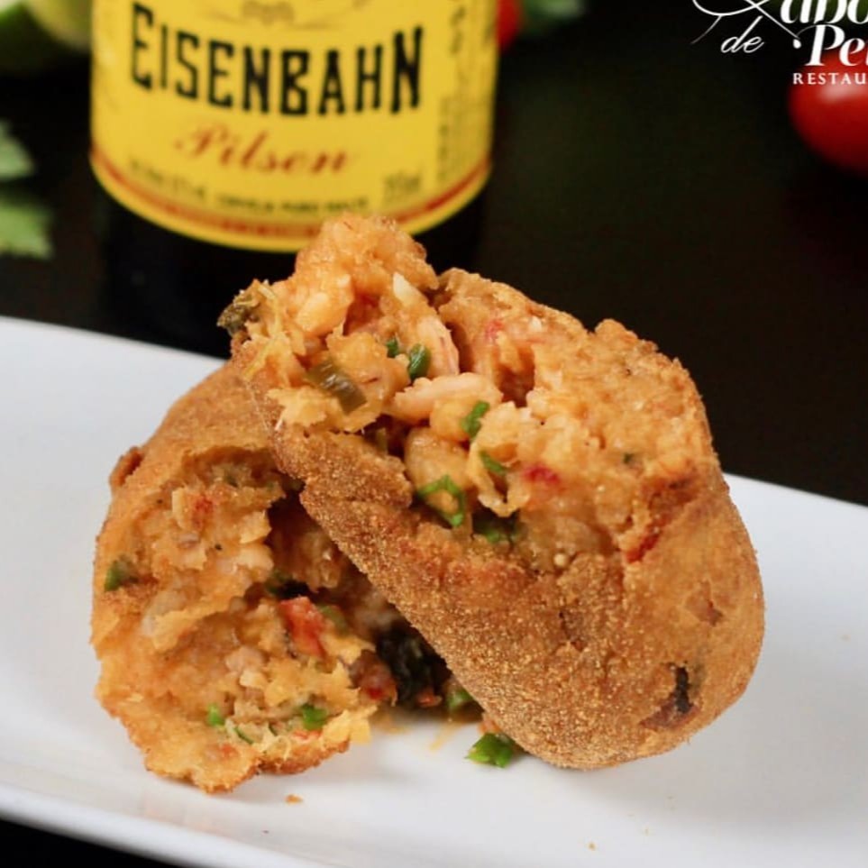 Crispy de alho poró, coberto com molho de tomate cereja, manjericão, azeite de oliva com ervas finas. Acompanha arroz branco e molho de camarão.