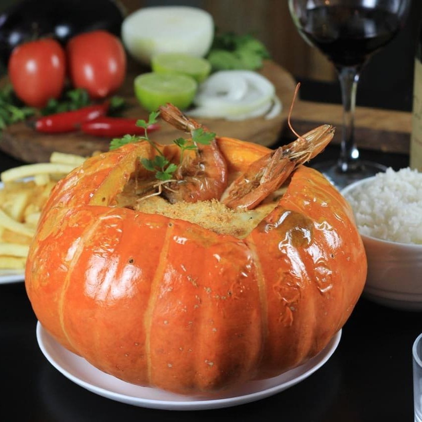 Camarões (400g) envolvidos por molho cremoso de moranga, leite de coco e Catupiry. Gratinado com queijo parmesão. Acompanha arroz branco e batata frita. *devido ao tamanho da embalagem, o prato não vai embalado na moranga*