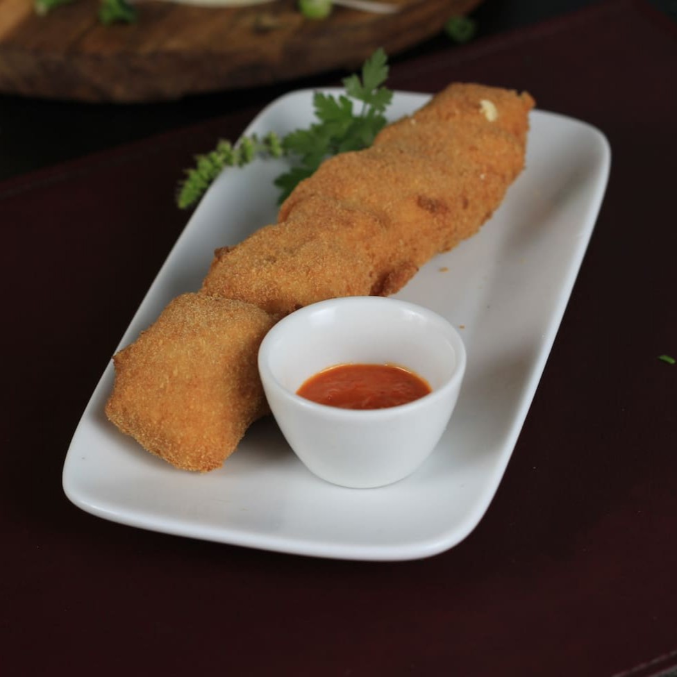 Filés empanados com queijo parmesão, arroz branco, molho de camarão e fritas.