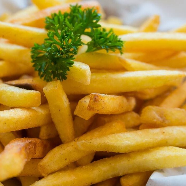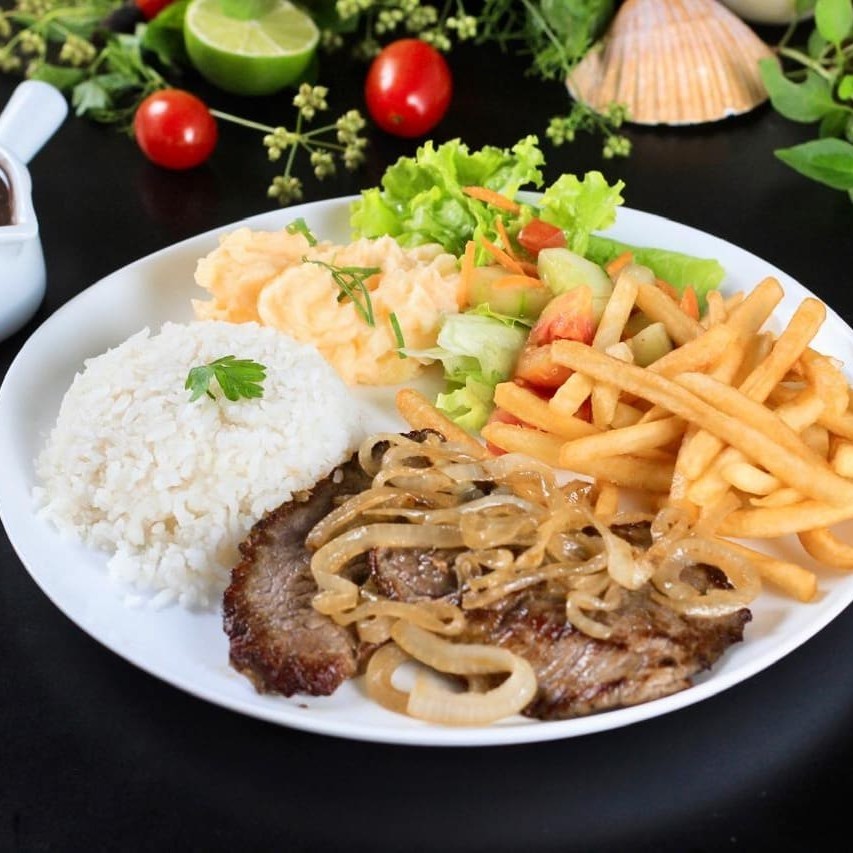 Acompanha arroz branco, farofa, maionese e batata frita.