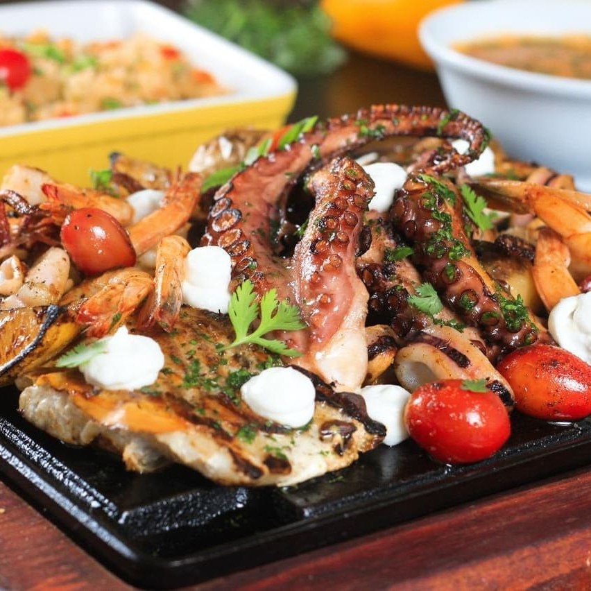 Polvo, camarões, lulas e pescada grelhada na chapa de ferro. Acompanha arroz baião de dois, aioli de limão siciliano e pirão de peixe.