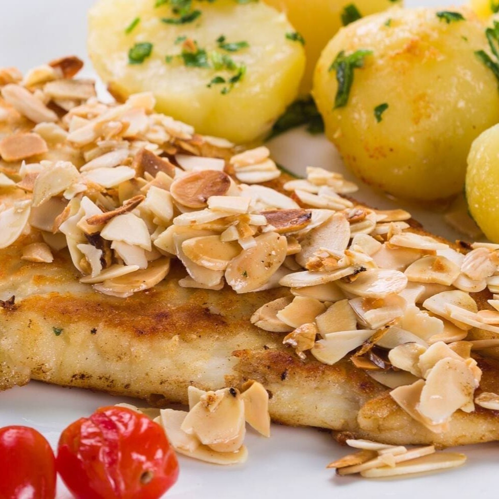 Amêndoas salteadas na manteiga com ervas finas, arroz branco, molho de camarão e batata sautê.