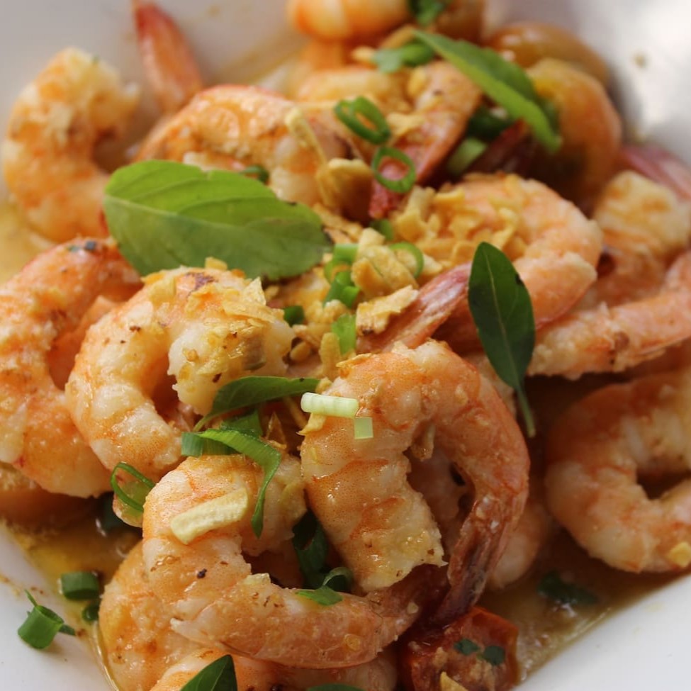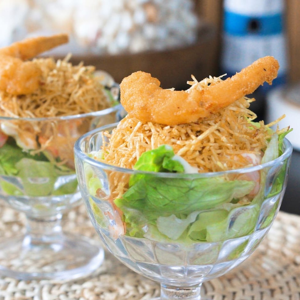Folhas de alface americana, com camarões, molho rosê e batata palha crocante.