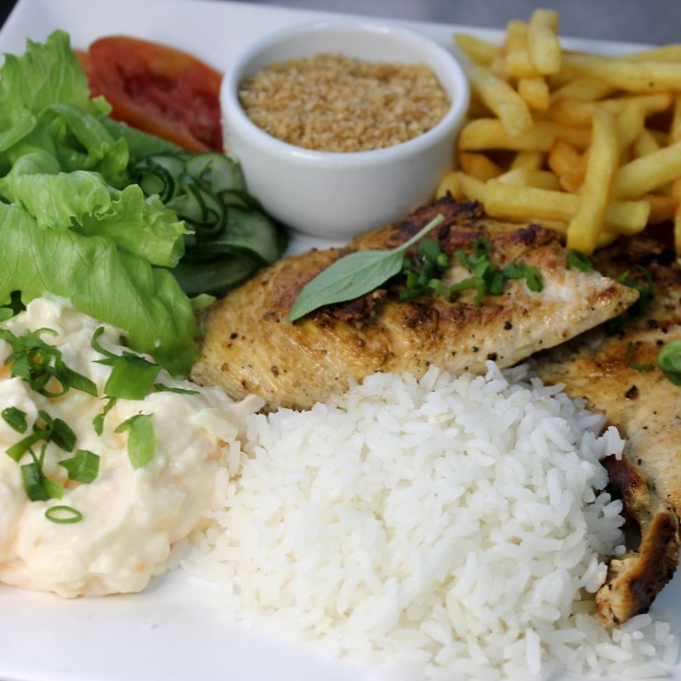 Filé de Frango à milanesa, grelhado ou à parmegiana. Acompanha arroz branco, batata frita ou legumes do Dia, maionese e salada. Escolha adicionar pirão de peixe ou feijão!