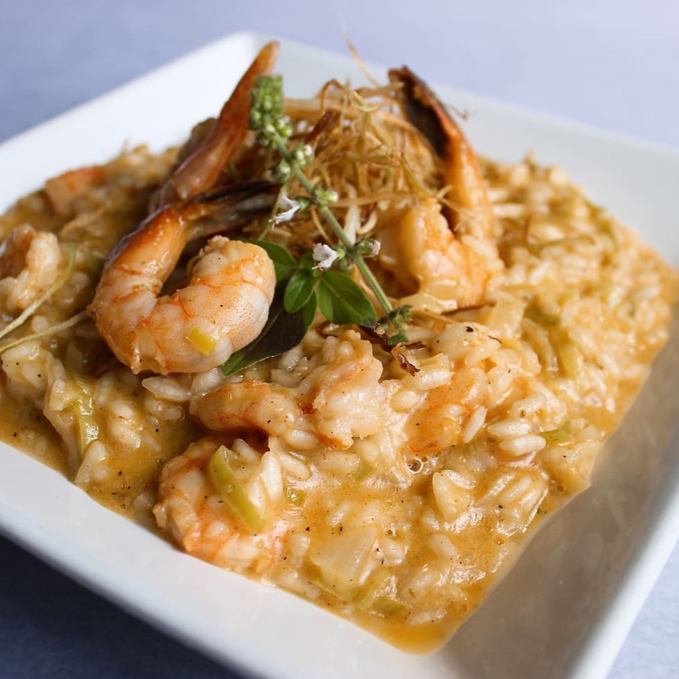 Arroz cremoso com camarões grelhados, ervilha fresca e cenoura. Gratinado com queijo muçarela e parmesão. Acompanha batata palha fininha.