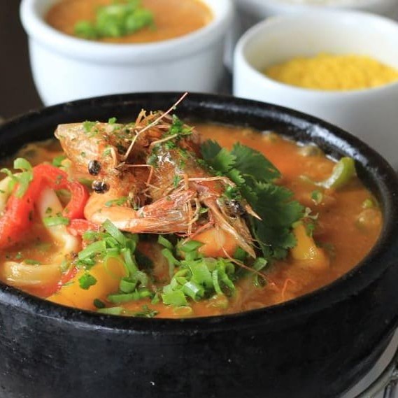 Muqueca de peixe, mista ou de camarão (selecione abaixo): Acompanha arroz, farofa de dendê e pirão.