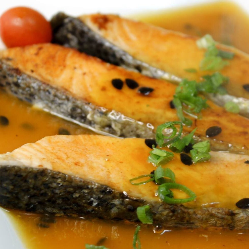 Salmão grelhado ao molho de maracujá. Acompanha batata sautê, pirão e arroz branco.