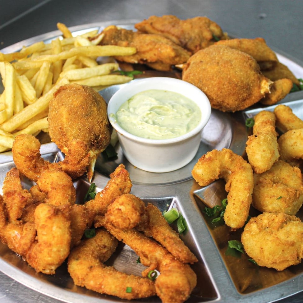 Marisco à vinagrete, 2 casquinhas de siri, 2 bolinhos de camarão, 2 espetos de camarão, 2 bolinhos de peixe, Filé de pescado à milanesa. Acompanhado de molho de camarão, maionese, batata frita, arroz branco. **não é possível alterar a combinação dos pratos**