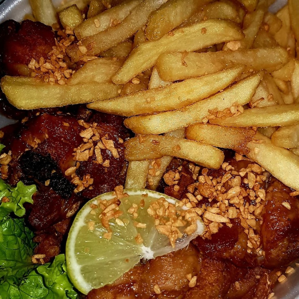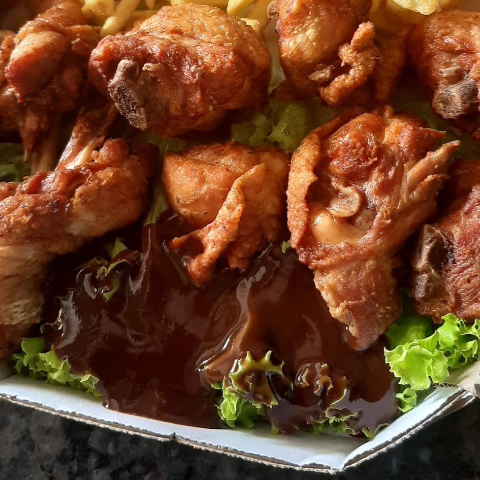 Deliciosa porção de batata frita bem sequinha com frango a passarinho bem suculento
