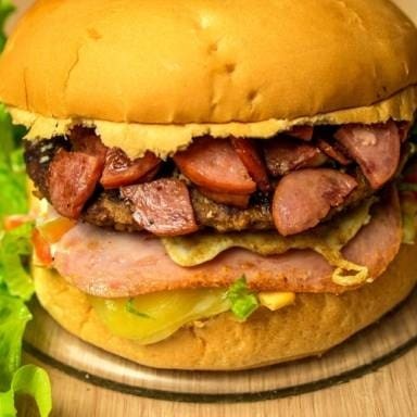 Um clássico irresistível! Pão de hamburguer macio,hamburguer suculento bovino,queijo derretido no ponto certo,presunto,deliciosas fatias de calabresa bem suculenta ,bacon defumado em pedaços bem fritinhos,cubos de peito de frango temperado e suculento e ovo no ponto certo,alface fresca e fatias de tomate,companha nosso delicioso molho de alho da casa,simples saboroso e feito com carinho! Ideal para matar a fome com muito sabor.