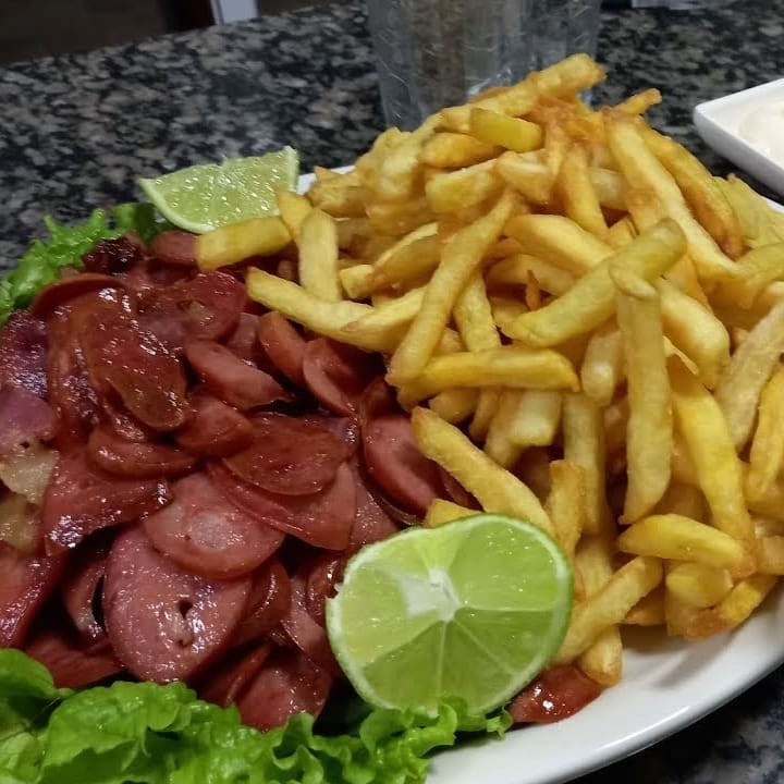 Porção de batata frita sequinha com calabresa acebolada bem suculenta