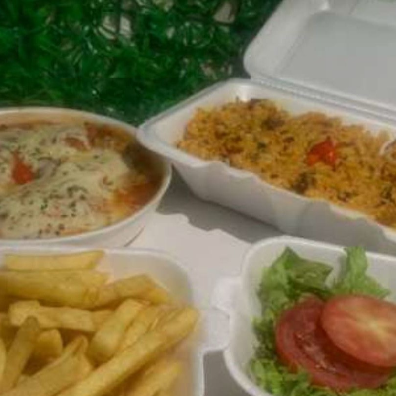 Deliciosa comida caseira contem: Arroz soltinho,feijao temperado c/ alho,macarrão ao sugo ou alho e oleo,refogado de legumes,um tipo de fritura,farofa temperada com bacon e calabresa e acompanha salada fresca,