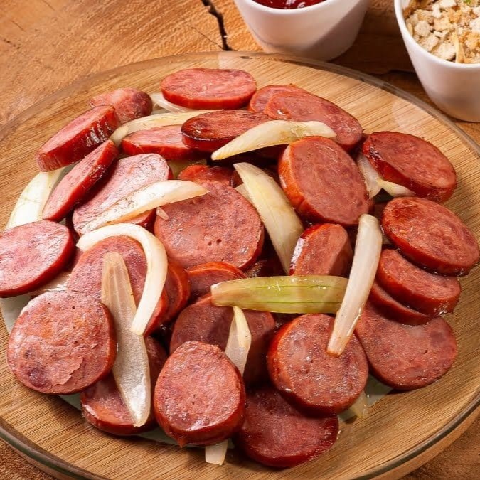 Uma deliosa comida caseira com calabresa acebolada acompanha:Arroz soltinho,feijao cremoso temperado com alho,macarrão alho e óleo,refogado de legumes,e uma frituta crocante e saborosa