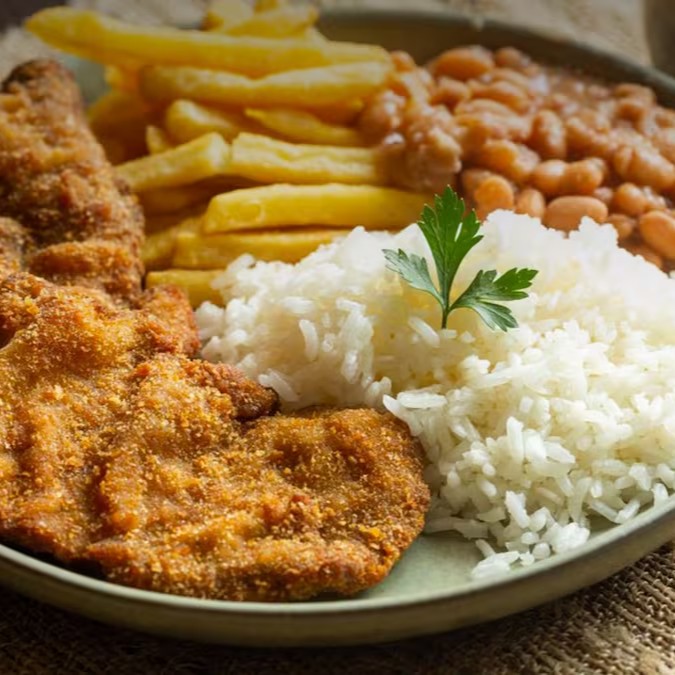 Marmita completa com arroz fresquinho, feijão caseiro, macarrão, farofa crocante, batata frita e frango à milanesa crocante. Uma combinação que conquista no primeiro sabor!