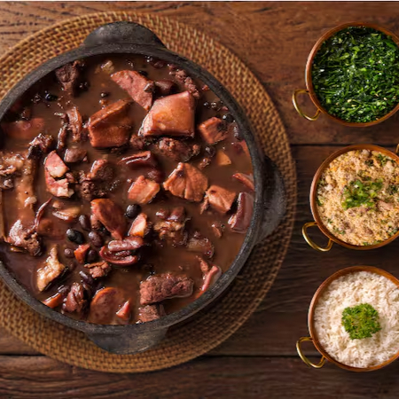 Marmita irresistível com arroz soltinho, feijoada encorpada, banana à milanesa, couve refogada, farofa de calabresa e torresmo crocante. Sabor autêntico em cada mordida!